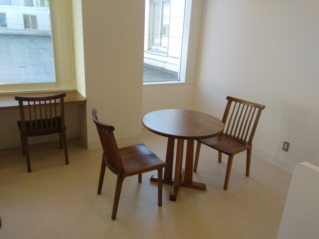病院の改装にあわせてデイルームの家具を納品させていただきました。クルミ総無垢材でぬくもりある家具になっています。