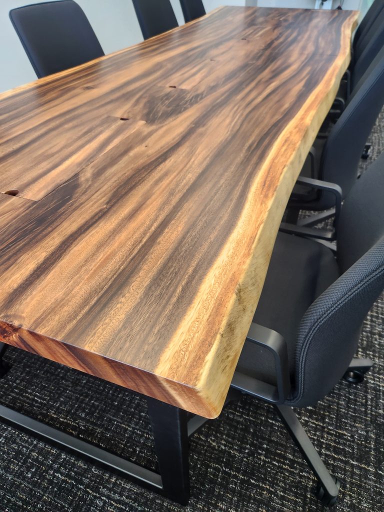 新社屋の完成に合わせて、社長室用の会議テーブルを納品いたしました。長さ3200 幅900~1000 のモンキーポッド材一枚板を2分割して配置換えにも対応できるように製作いたしました。