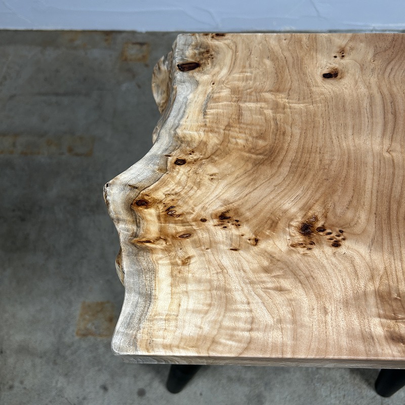 【材 質】欅(けやき)材 一枚板 テーブル用天板 セール 【サイズ】幅 1820 mm × 奥行 940 mm 〜 760 mm × 厚 57 mm 【型 番】t969 【価 格】225,000円(税別) ※脚製作費/3万から8万円程度。デザイン・天板の大きさにより変わります。ご相談ください。