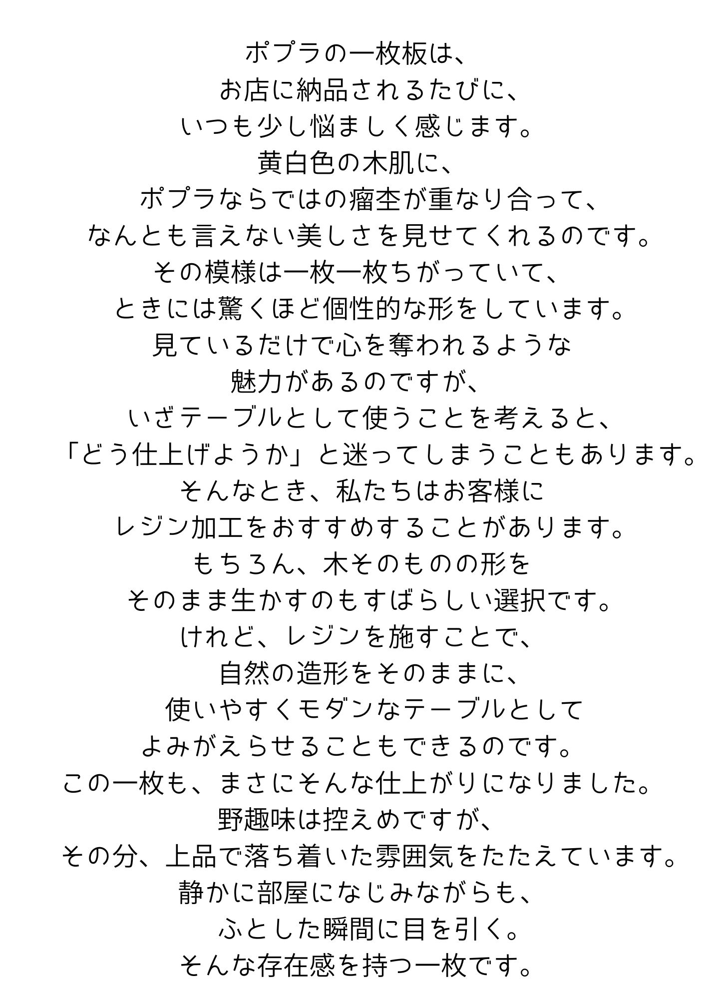 ポプラ材の面白い形や木目、光沢などを存分にお楽しみいただけます。