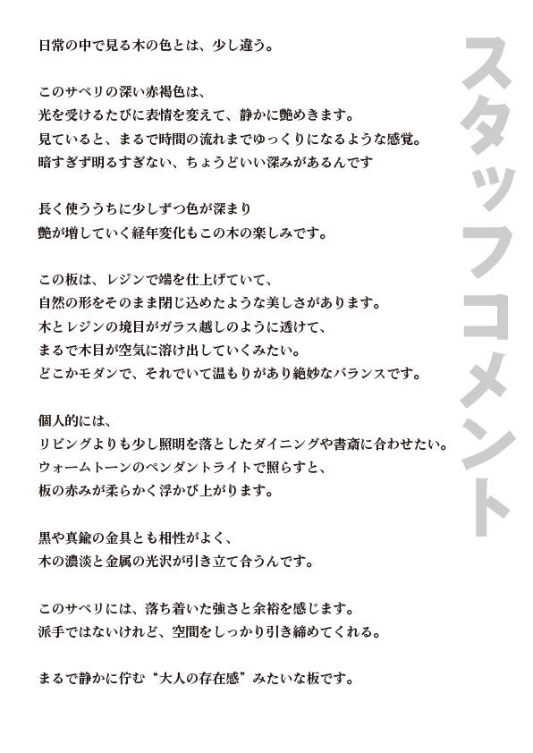 *日常の中で見る木の色とは、少し違う。 このサペリの深い赤褐色は、 光を受けるたびに表情を変えて、静かに艶めきます。 見ていると、まるで時間の流れまでゆっくりになるような感覚。 暗すぎず明るすぎない、ちょうどいい深みがあるんです 長く使ううちに少しずつ色が深まり 艶が増していく経年変化もこの木の楽しみです。 この板は、レジンで端を仕上げていて、 自然の形をそのまま閉じ込めたような美しさがあります。 木とレジンの境目がガラス越しのように透けて、 まるで木目が空気に溶け出していくみたい。 どこかモダンで、それでいて温もりがあり絶妙なバランスです。 個人的には、 リビングよりも少し照明を落としたダイニングや書斎に合わせたい。 ウォームトーンのペンダントライトで照らすと、 板の赤みが柔らかく浮かび上がります。 黒や真鍮の金具とも相性がよく、 木の濃淡と金属の光沢が引き立て合うんです。 このサペリには、落ち着いた強さと余裕を感じます。 派手ではないけれど、空間をしっかり引き締めてくれる。 まるで静かに佇む“大人の存在感”みたいな板です。