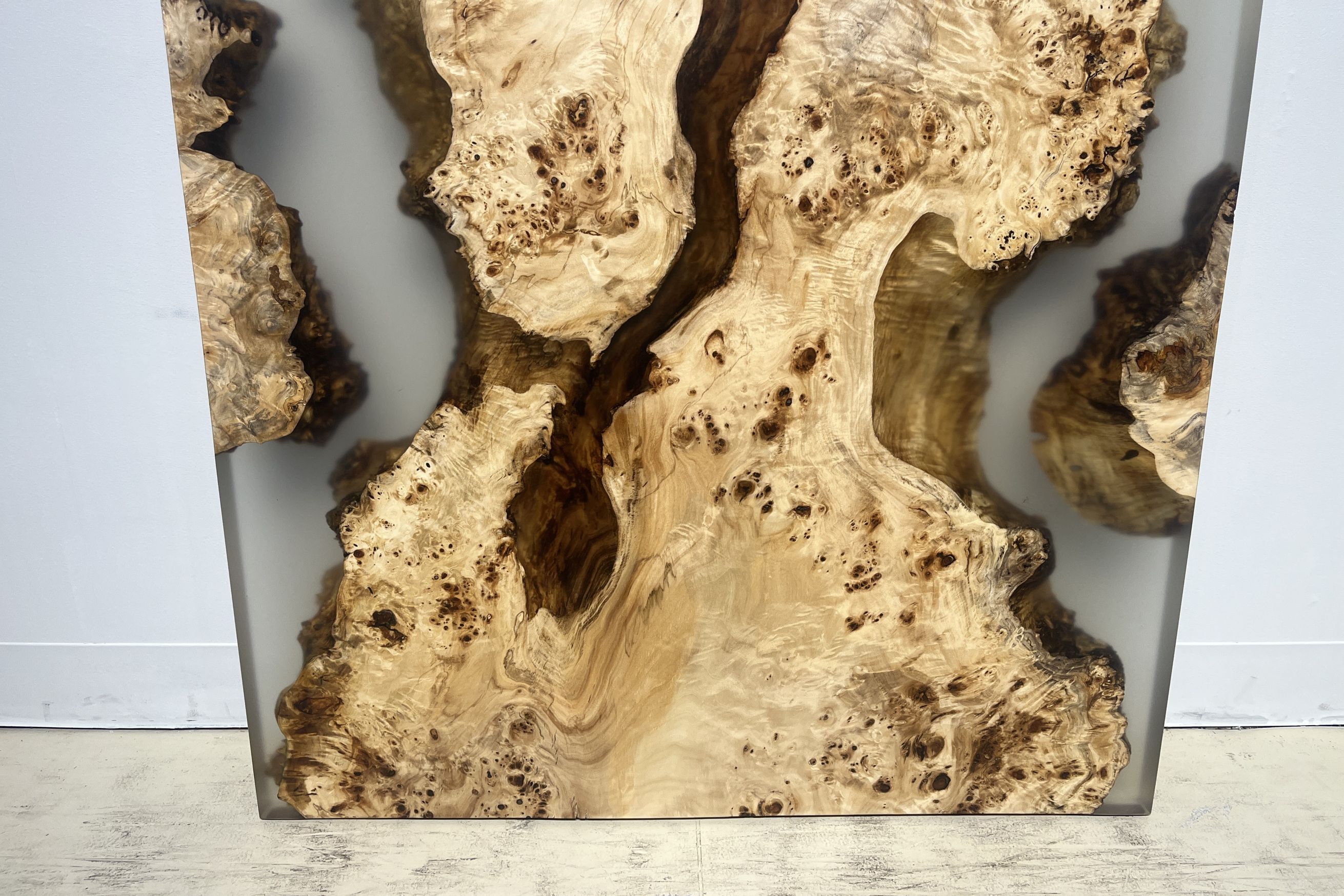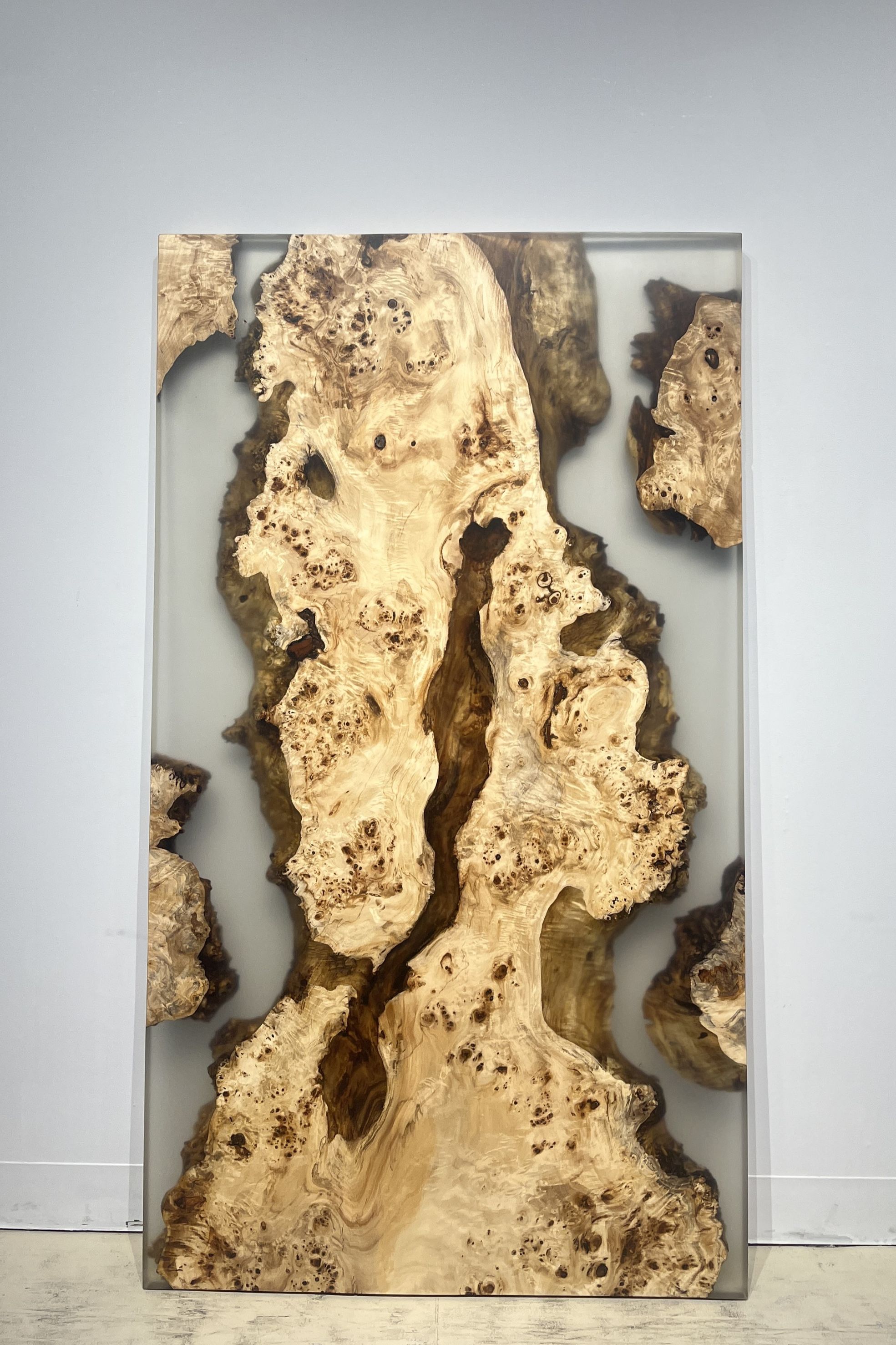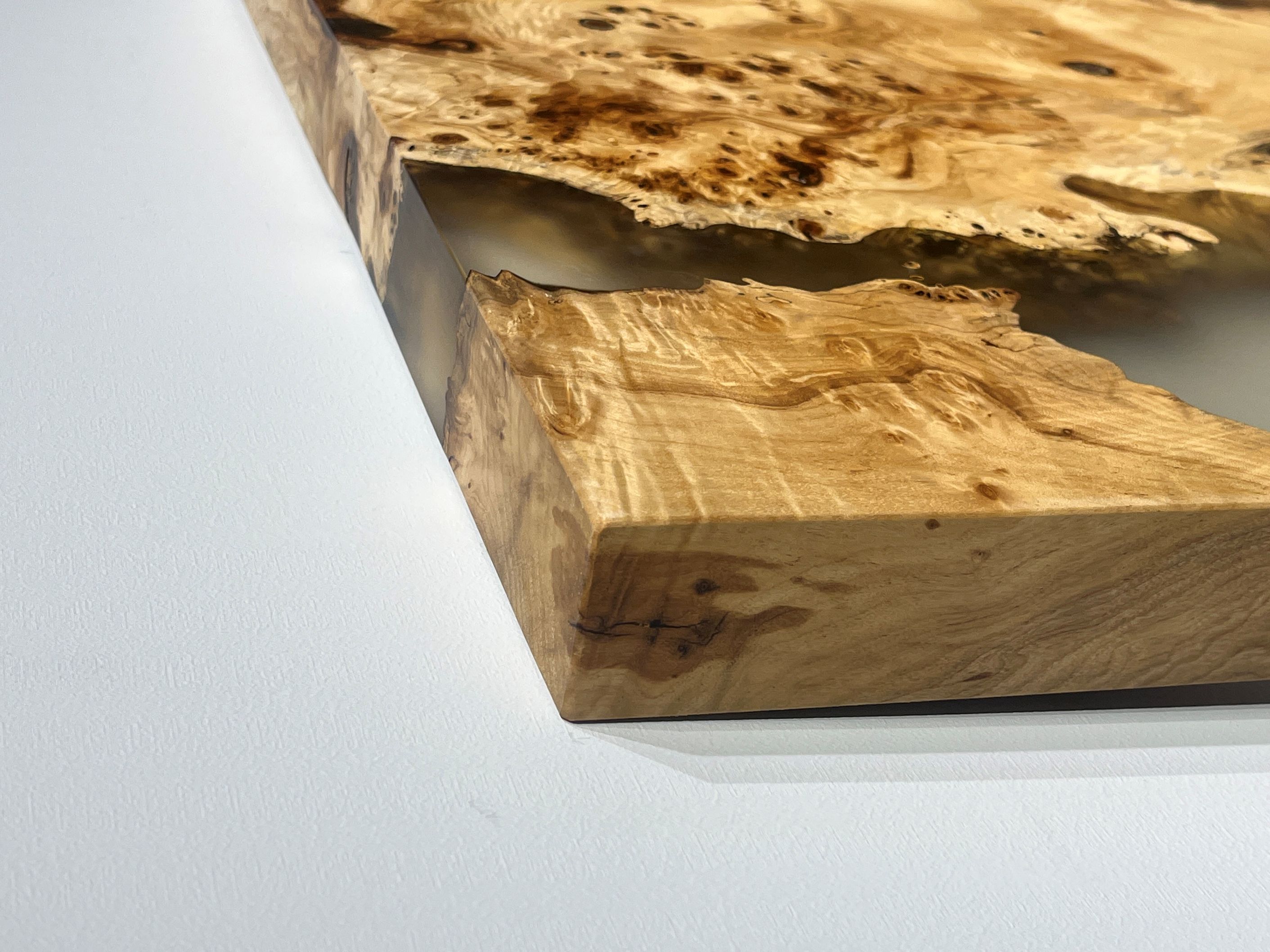 変形のポプラ材一枚板をレジンを使ってお使いやすい形に仕上げた天板です。
