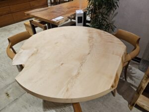 一部に皮目を残して仕上げる変形丸テーブルも人気です。