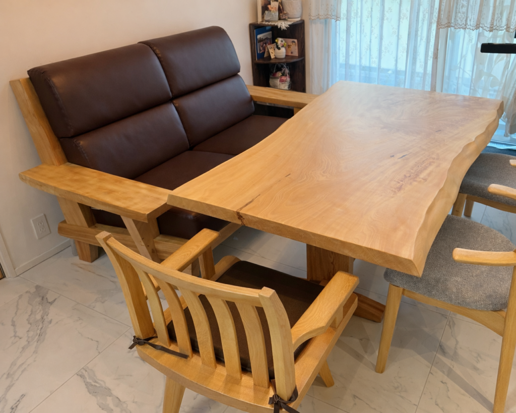 この度、栃材(とちざい)の一枚板ダイニングテーブルセットと、栃材総無垢の原木ソファーをお客様のお宅へ納品させていただきました。