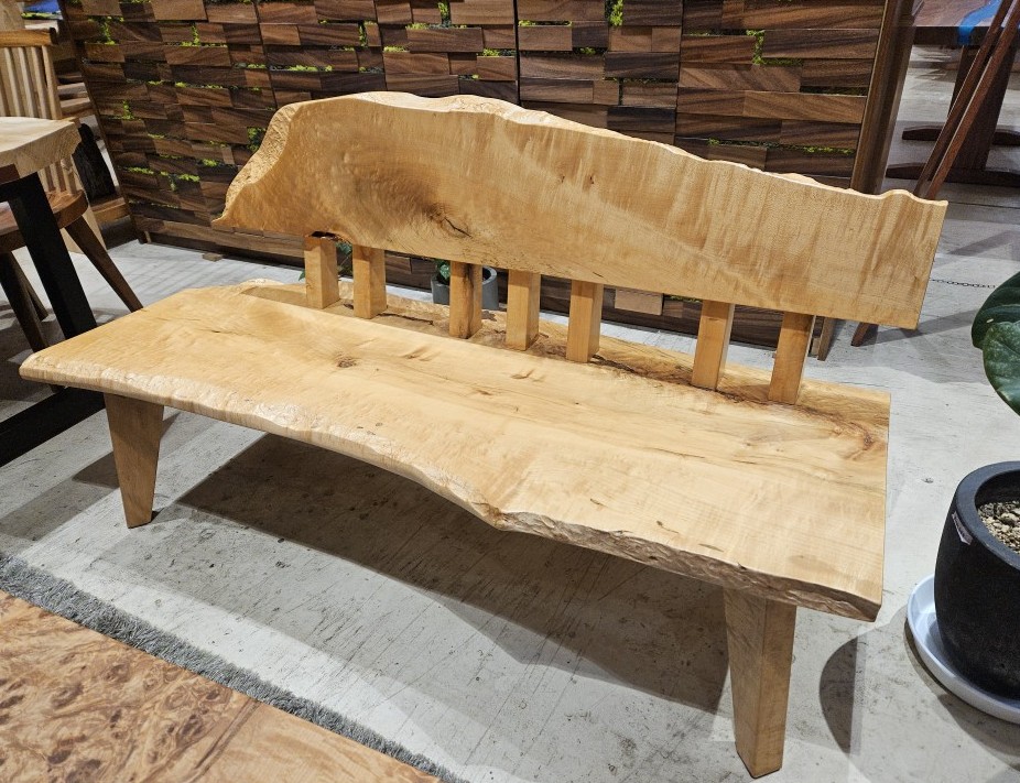 ・幅のある一枚板を縦にカットし、座面と背もたれに加工したベンチ