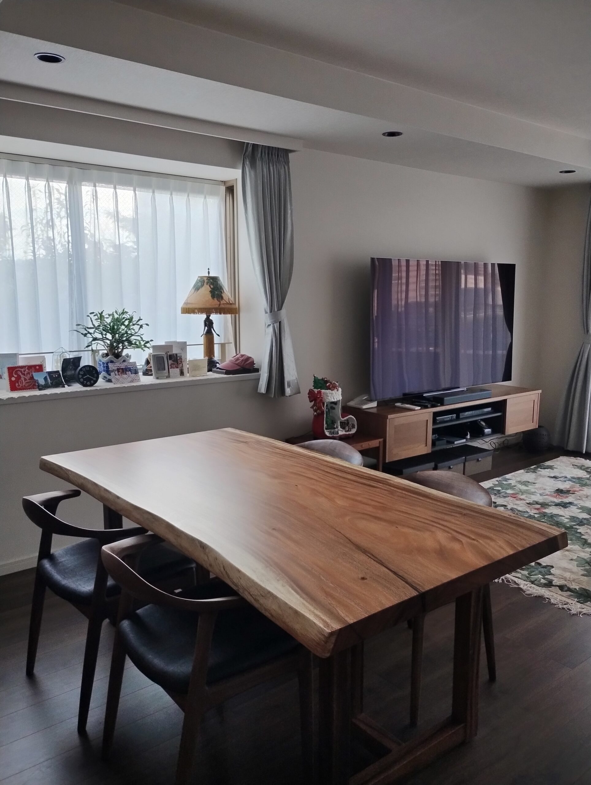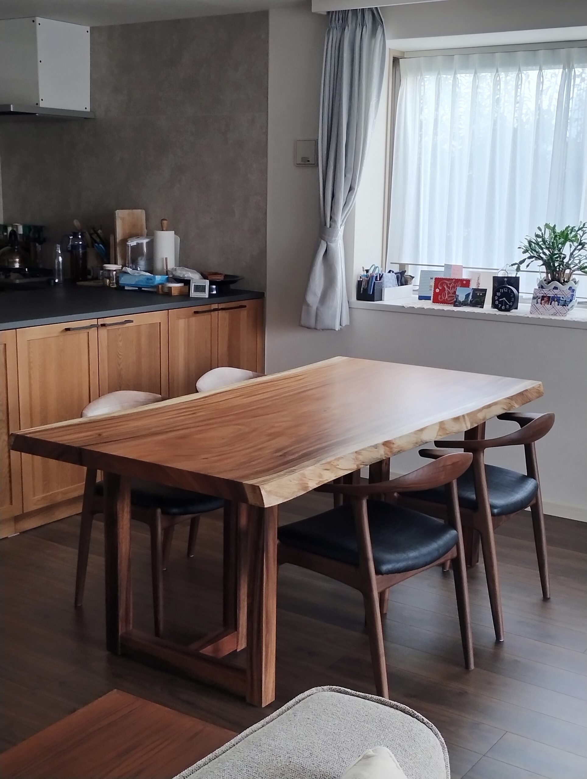 この度は素敵なお写真と、ありがたいコメントをいただき、心より御礼申し上げます。一枚板ならではのモンキーポッド材の豊かな表情と、落ち着いた色合いのグラデーションがお部屋の雰囲気に良く馴染み、ナチュラルな魅力がいっそう際立っています。
