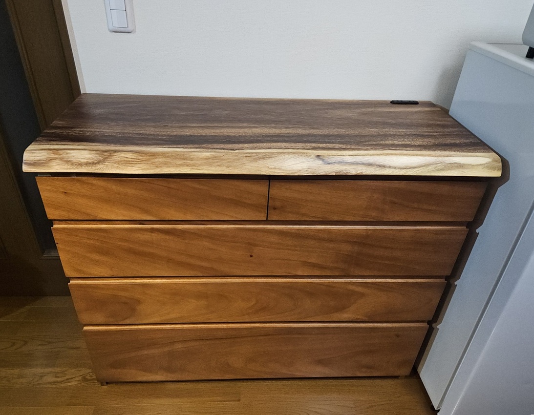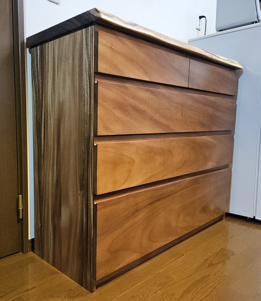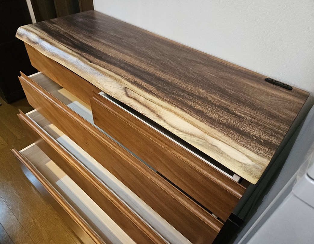天板・側板・引き出し前板のすべて一枚板で、しかも引き出しの木目がつながっているのが本当にきれいで、見るたびに嬉しくなります。