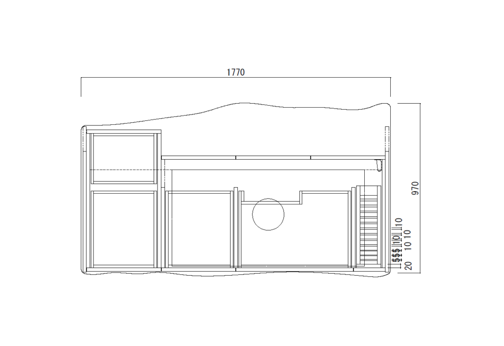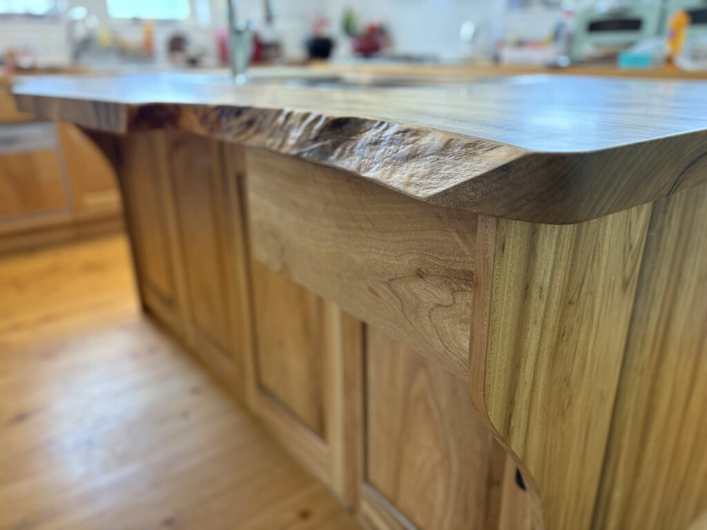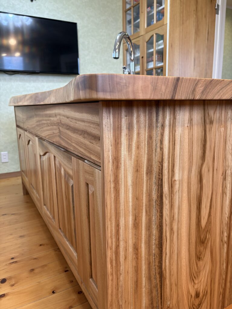 楠の一枚板を使用し、割れ部分はレジンで加工しました。縮み杢の自然なフォルムの一枚板です。