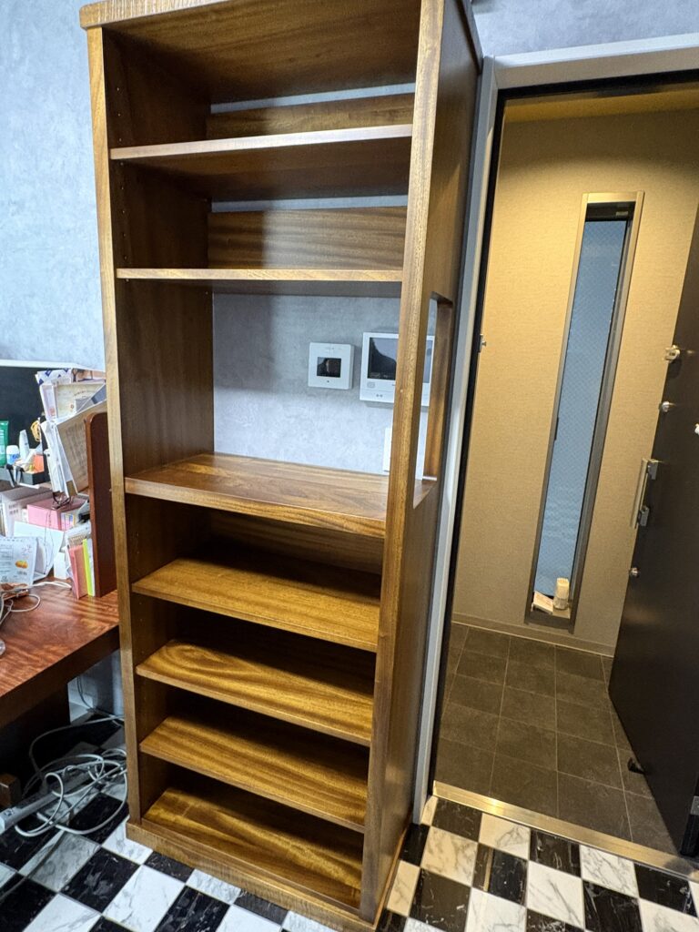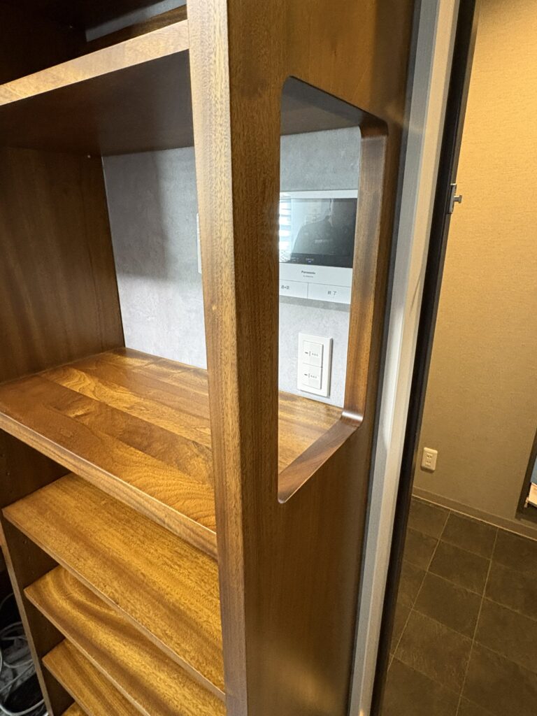 この度は、ご注文ありがとうございました。インターホン部分の使い勝手も考慮した書棚がほしいというご要望にお応えしてすべてをオーダーメイドしました。